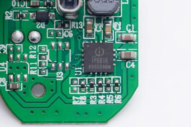 Detailný záber na SOC správy napájania Yingjixin IP6816, čip je zabalený v 4 x 4 mm QFN16. Jediný čip dopĺňa správu nabitia a vybitia batérie, zobrazenie stavu batérie, kontrolu výstupnej záťaže a ďalšie funkcie.